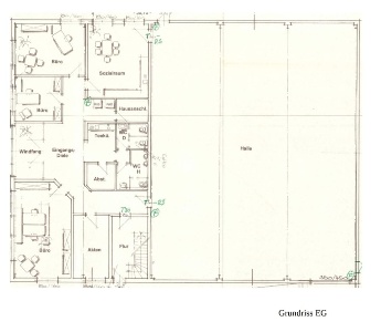 Im Erdgeschoss befinden sich vier Büros. Ein fünftes Büro wurde durch den Vormieter als Werkstatt genutzt, könnte aber auch wieder als Büro genutzt werden. Ein Glasfaseranschluss für schnelles Internet ist ebenfalls vorhanden. Zu den Büros gelangt man über einen großzügigen Empfangsbereich mit Windfang und Eingangsdiele. Es sind außerdem zwei Küchen sowie ein Abstellraum vorhanden.